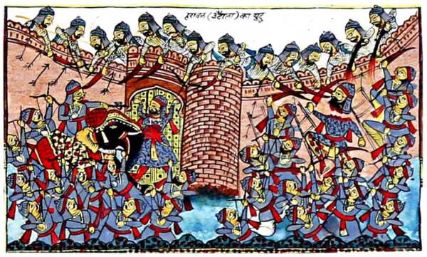 वे लड़े तथा मुगल सैनिकों द्वारा काट दिए गए। इस लड़ाई में दिल्ली के प्रशासक मरहूम तातार खाँ का बेटा दोस्त मोहम्मद शहीद हो गया। मुल्ला अब्दुल कादिर बदायूंनी ने बहुत संक्षेप में इस घटना का उल्लेख किया है। अबुल फजल ने लिखा है कि बहुत से लोग मंदिर में छिप गए।